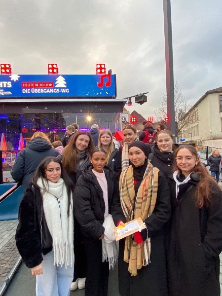 Am vorletzten Tag des Weihnachtswunders machten sich einige Schülerinnen des Häkelkurses auf den Weg nach Paderborn. Dort stand ein Glashaus, in dem das WDR2-Radiostudio eingerichtet war. Die vier Moderatoren – Steffi Neu, Sabine Heinrich, Jan Malte Andresen und Thomas Bug – sendeten rund um die Uhr live im Radio und per Livestream. Glücklicherweise war die Warteschlange am Vormittag noch überschaubar, sodass wir nach etwa 30 Minuten vor dem Glashaus standen. In dieser Zeit konnten wir uns sogar mehrfach im Livestream sehen! Unser Umschlag landete schließlich in der großen Spendenbox, und wir erlebten die sympathischen Moderatoren hautnah.